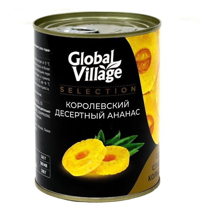 Консервы фруктовые стерилизованные: ананас кольца в сиропе "Global Village Selection", в жестяной банке объемом 580 мл, массой 565 гр.